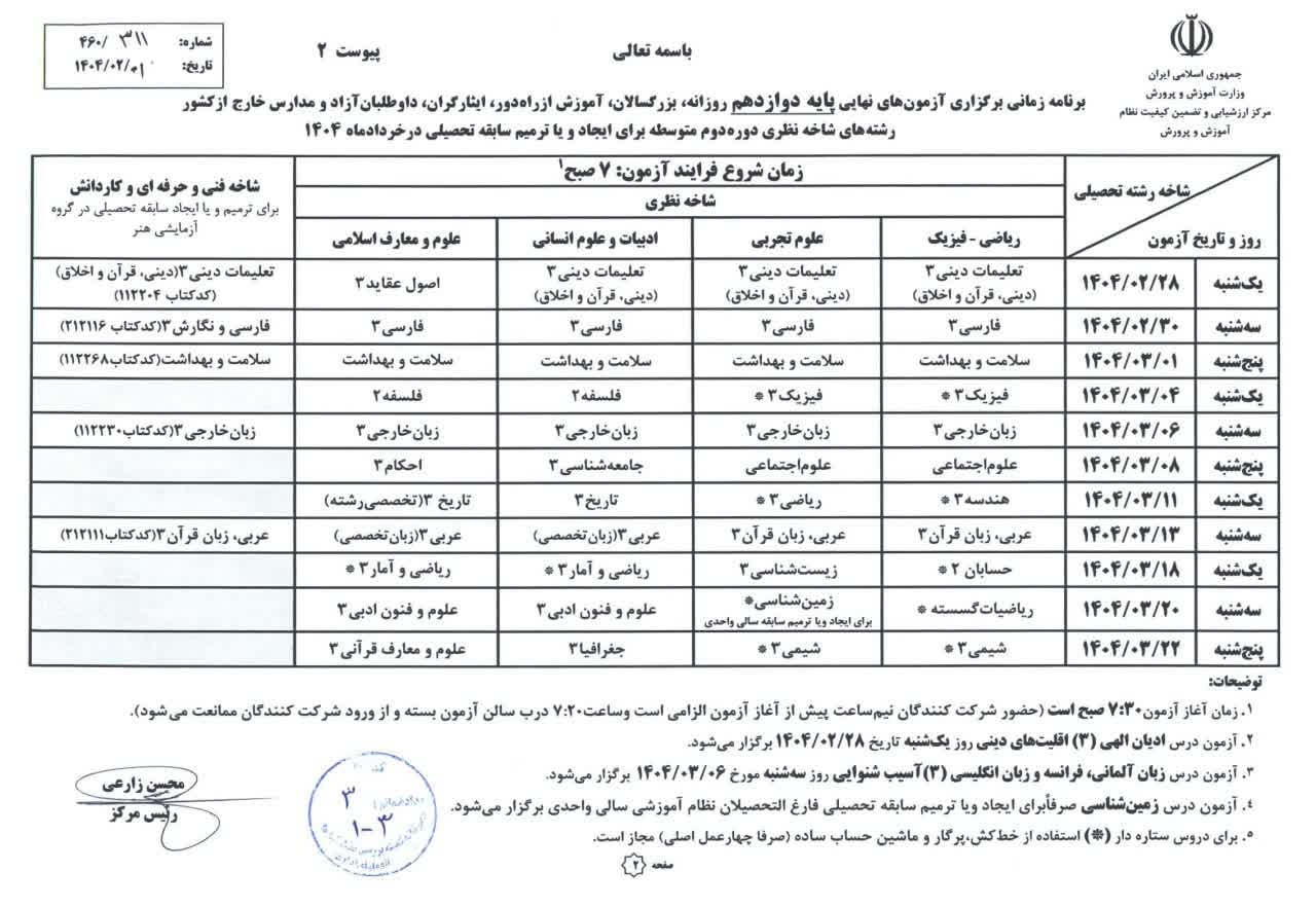 برنامه زمانی برگزاری آزمون های نهایی خرداد ۱۴۰۴ - پایه های یازدهم و داوزدهم